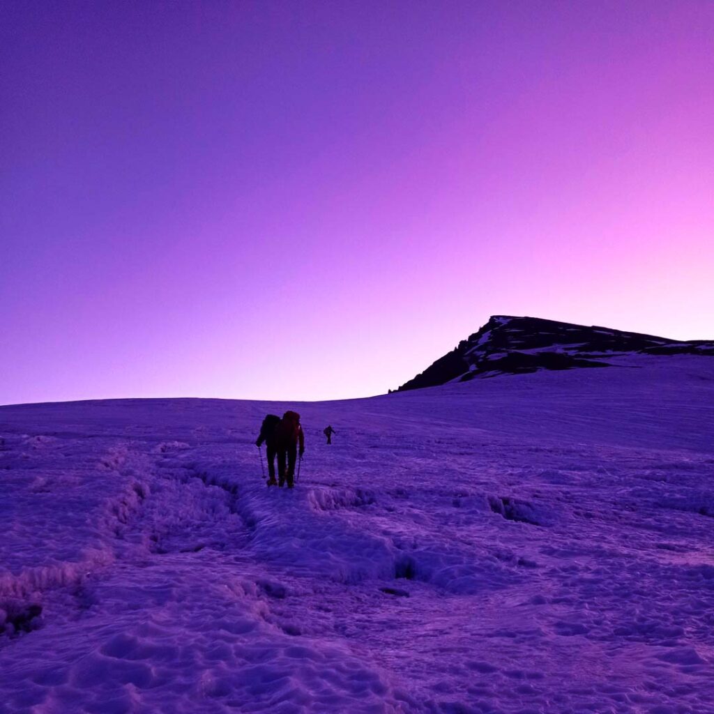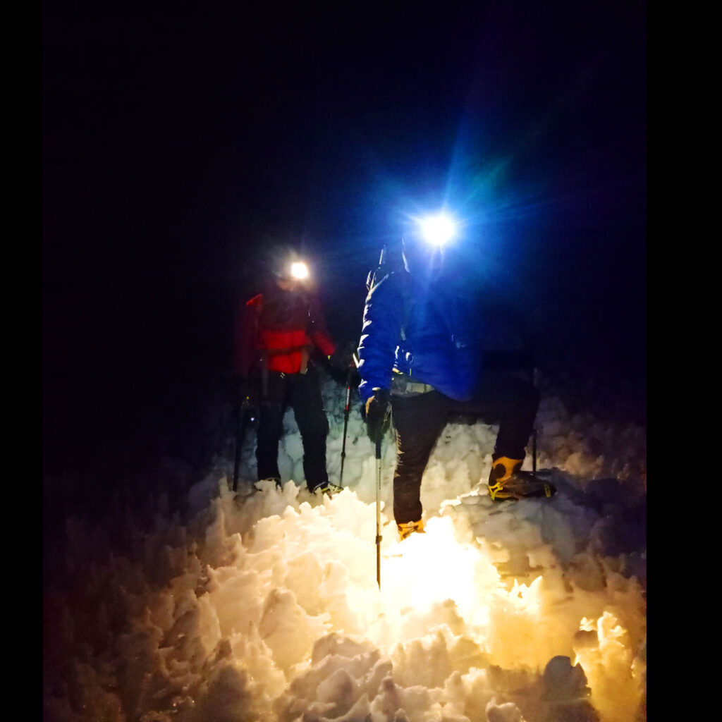 Luego de unos 30 minutos, vimos dos luces a lo lejos y seguimos el mismo rumbo que ellas intentando identificar sus huellas. El camino tenía tramos de fácil andar y otros donde los penitentes alcanzaban mayor profundidad,sin embargo, para fortuna nuestra, no divisamos grietas, o quizás pasamos sobre ellas sin darnos cuenta.