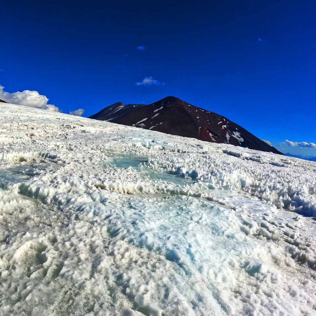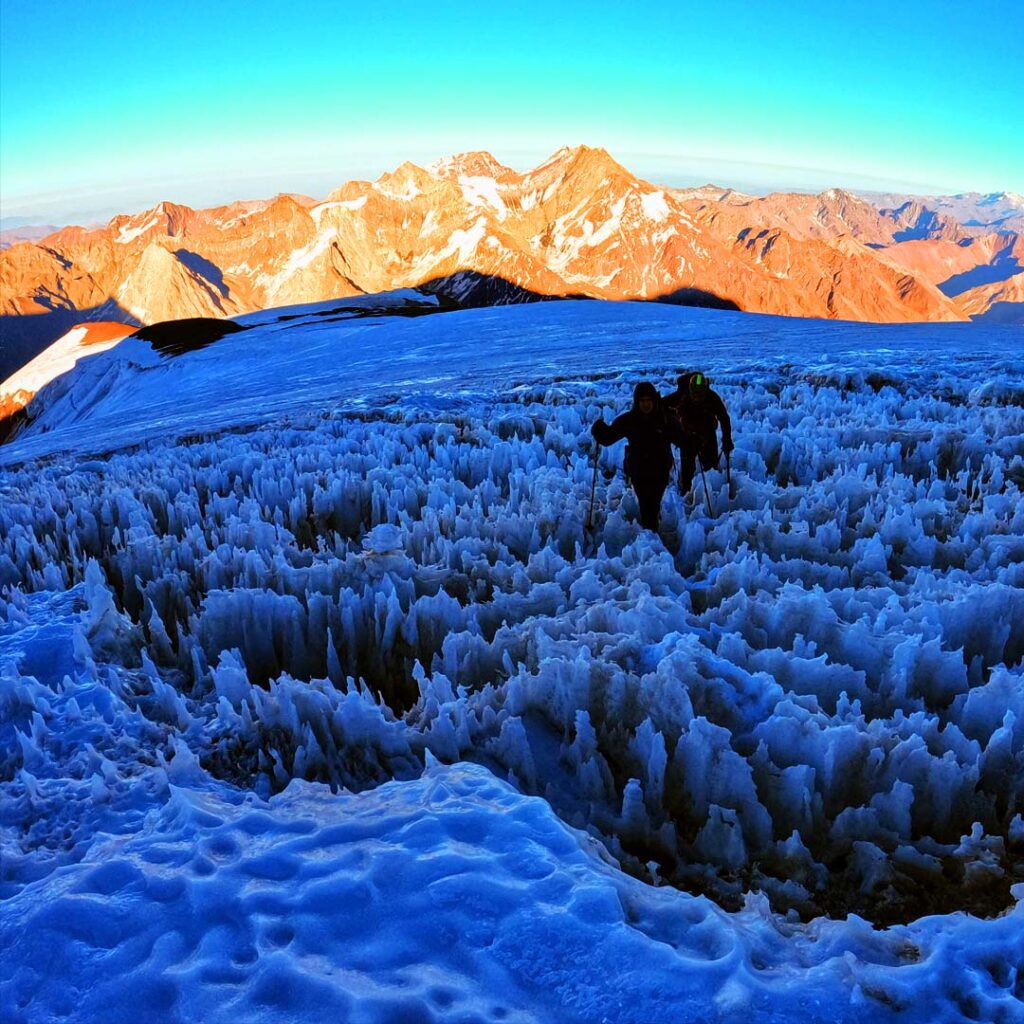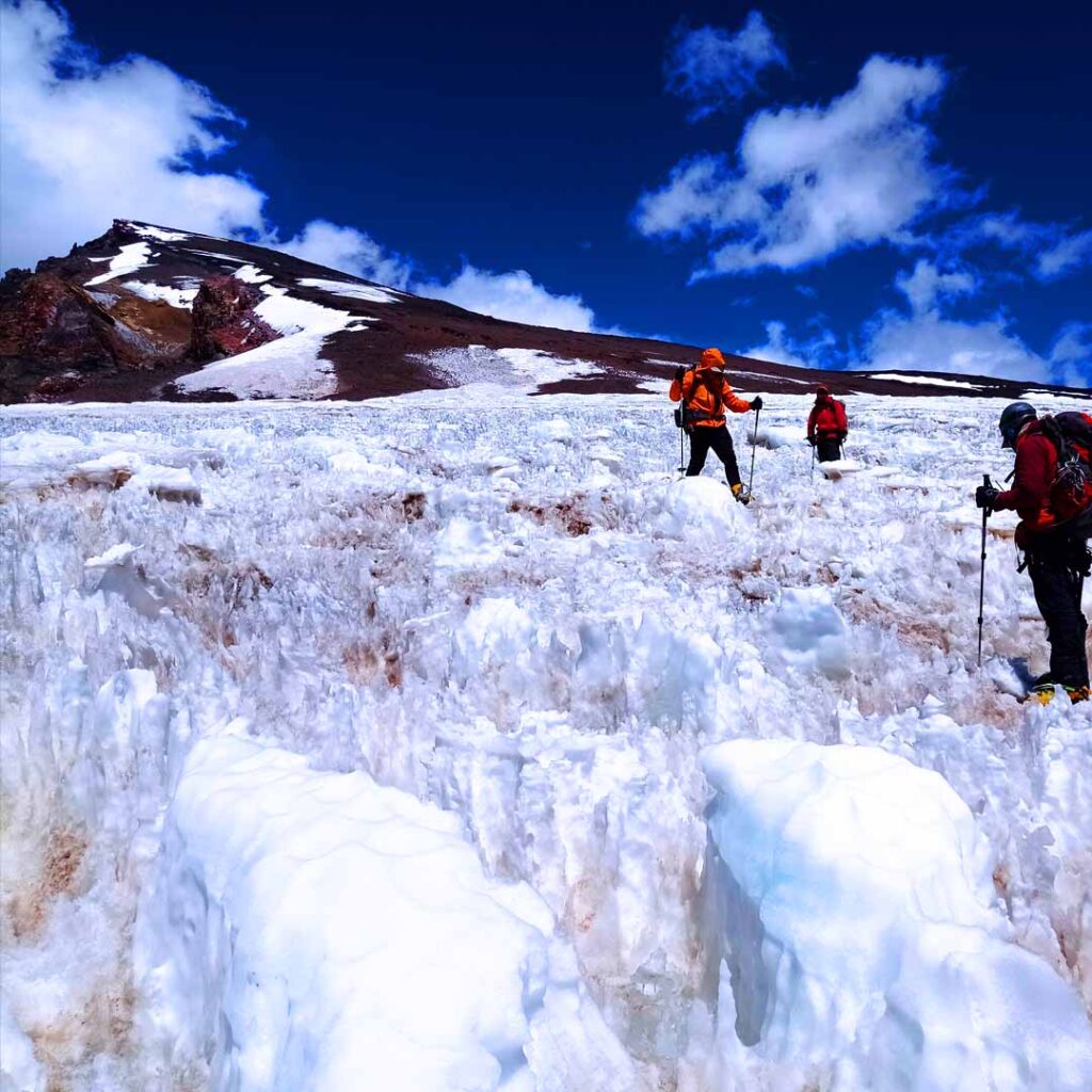 Continuamos avanzando por un último tramo lleno de penitentes que se resquebrajan al pasar y algunas grietas comenzaron a divisarse. Sabíamos que ese era el último esfuerzo para salir de la zona glaciar, aunque no pude dejar de pensar en lo compleja que sería la vuelta.