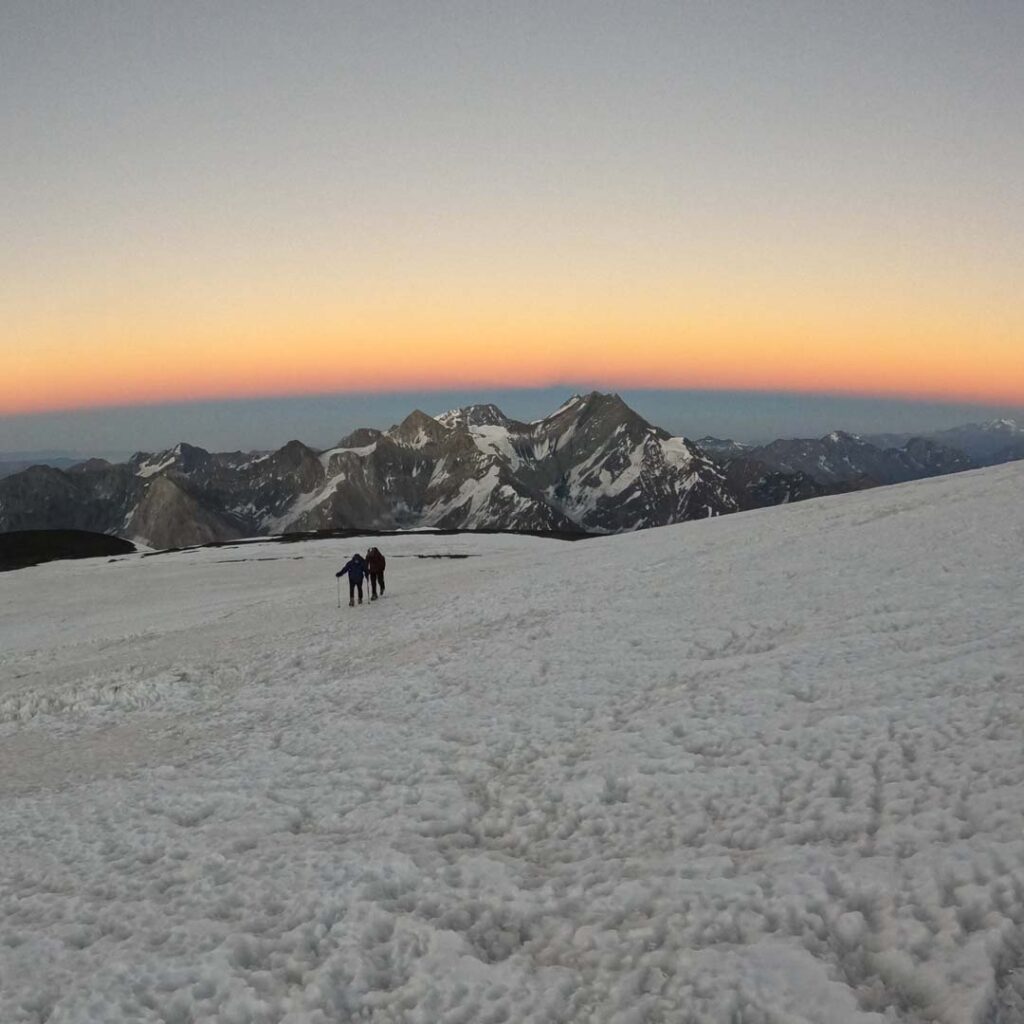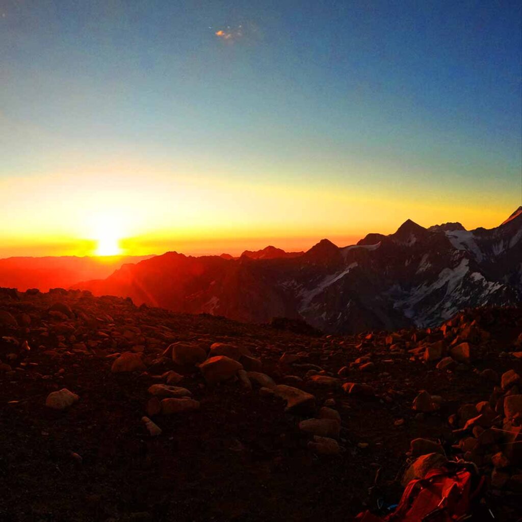 A medida que el sol se escondía tras las montañas la temperatura comenzó a descender, pero no sin antes mirar nuestro objetivo del día siguiente que reflejaba la luz del atardecer. Comimos algo más, ordenamos nuestras cosas y nos fuimos a dormir.