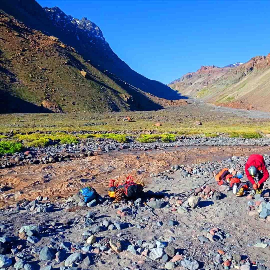 Luego de descansar unos momentos, mirando las montañas y tomando té sobre las rocas, buscamos un lugar para armar nuestras carpas.