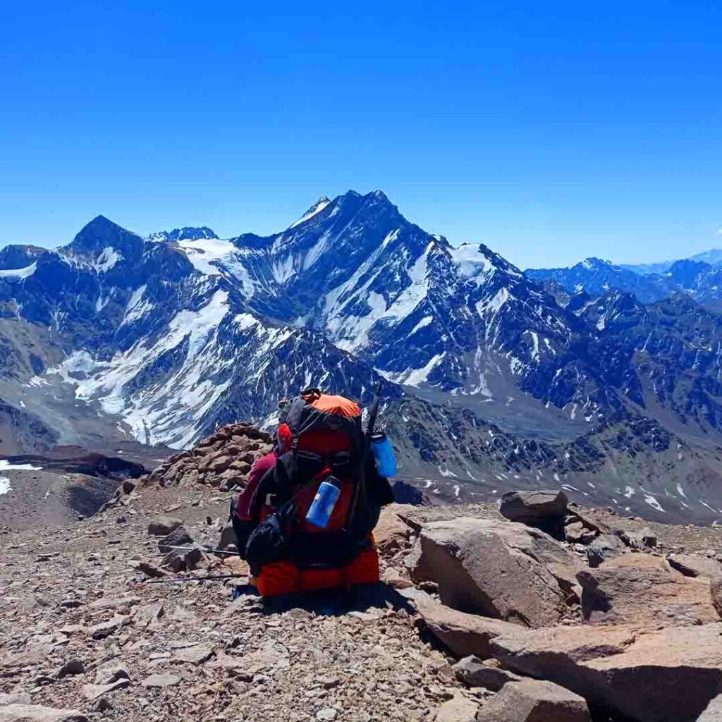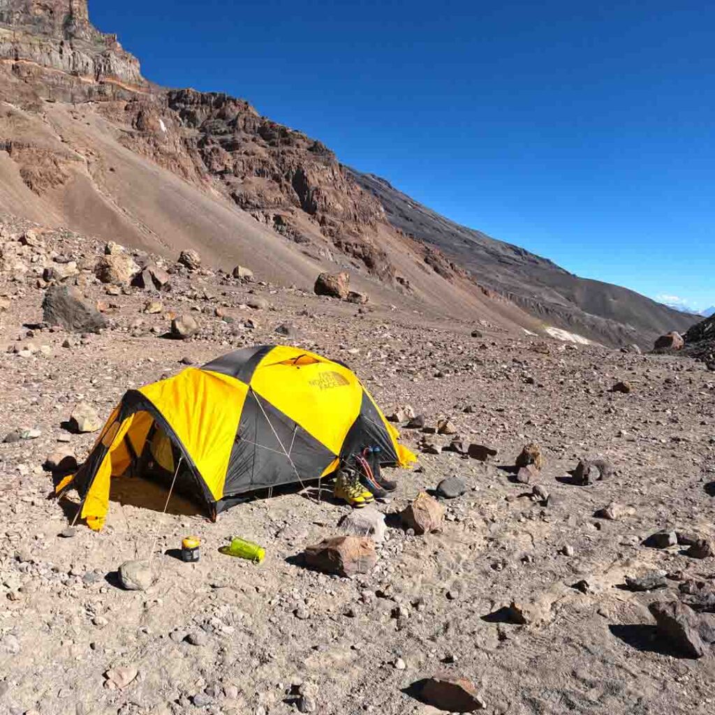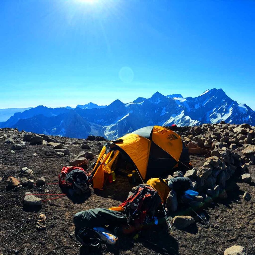 Armamos nuestro campamento con una hermosa vista. El día estaba despejado, a lo lejos visualizamos la cumbre y el extenso campo de nieve, hielo y penitentes que deberíamos sortear si queríamos acceder a ella.