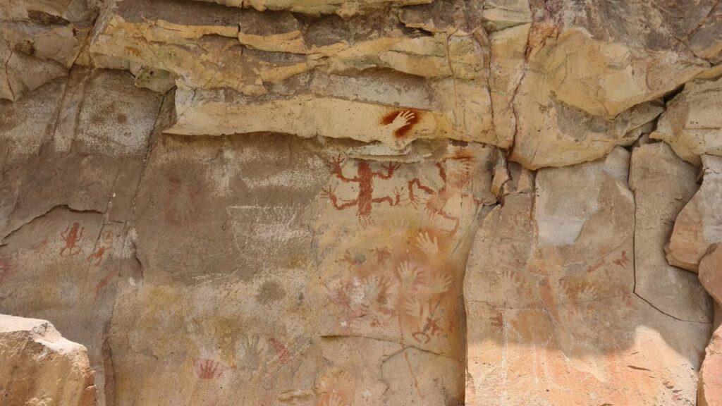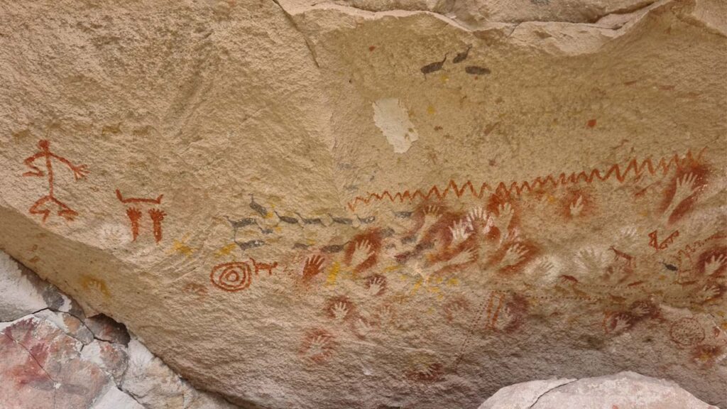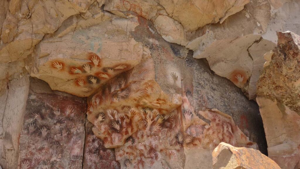En los muros aledaños, cientos de manos rojas, violáceas, ocres y negras se mezclan con escenas de cacería y de persecución. Estas figuras están fechadas entre 9.300 y 7.300 años A.P, pero se superponen otras blancas, figuras de guanacos de gran tamaño y patas de animales en negativo que van desde 7.300 a 3.330 AP.